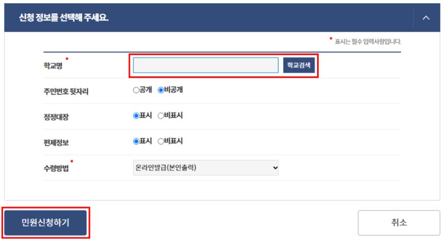 ⑥ 학교명 입력. 본인이 졸업한 학교명을 검색하시고 수령 방법을 선택하신 후 민원신청하기 버튼 클릭하면 원하는 방법으로 발급이 가능합니다.