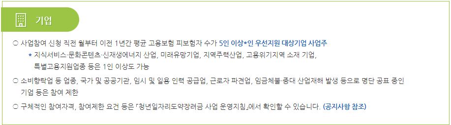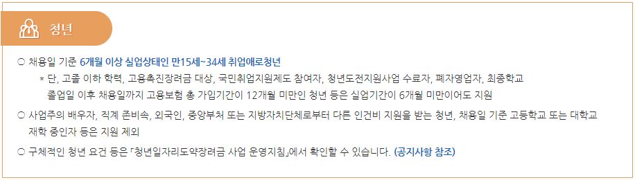 지원요건: 정규직 채용 후 6개월 이상 계속 근무해야 하며, 주 30시간 이상 근로 및 최저임금 이상을 지급, 고용보험 가입